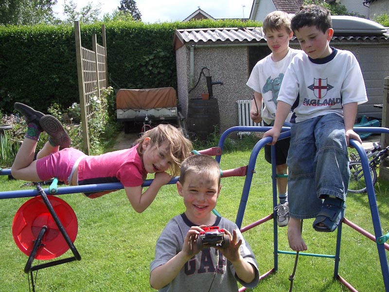 The children sometimes played with the HotCam in a car context; racing, crashing, jumping, etc, Other times they would use it as a simple and accessible video camera; exploring, explaining, showing off, spying, etc.